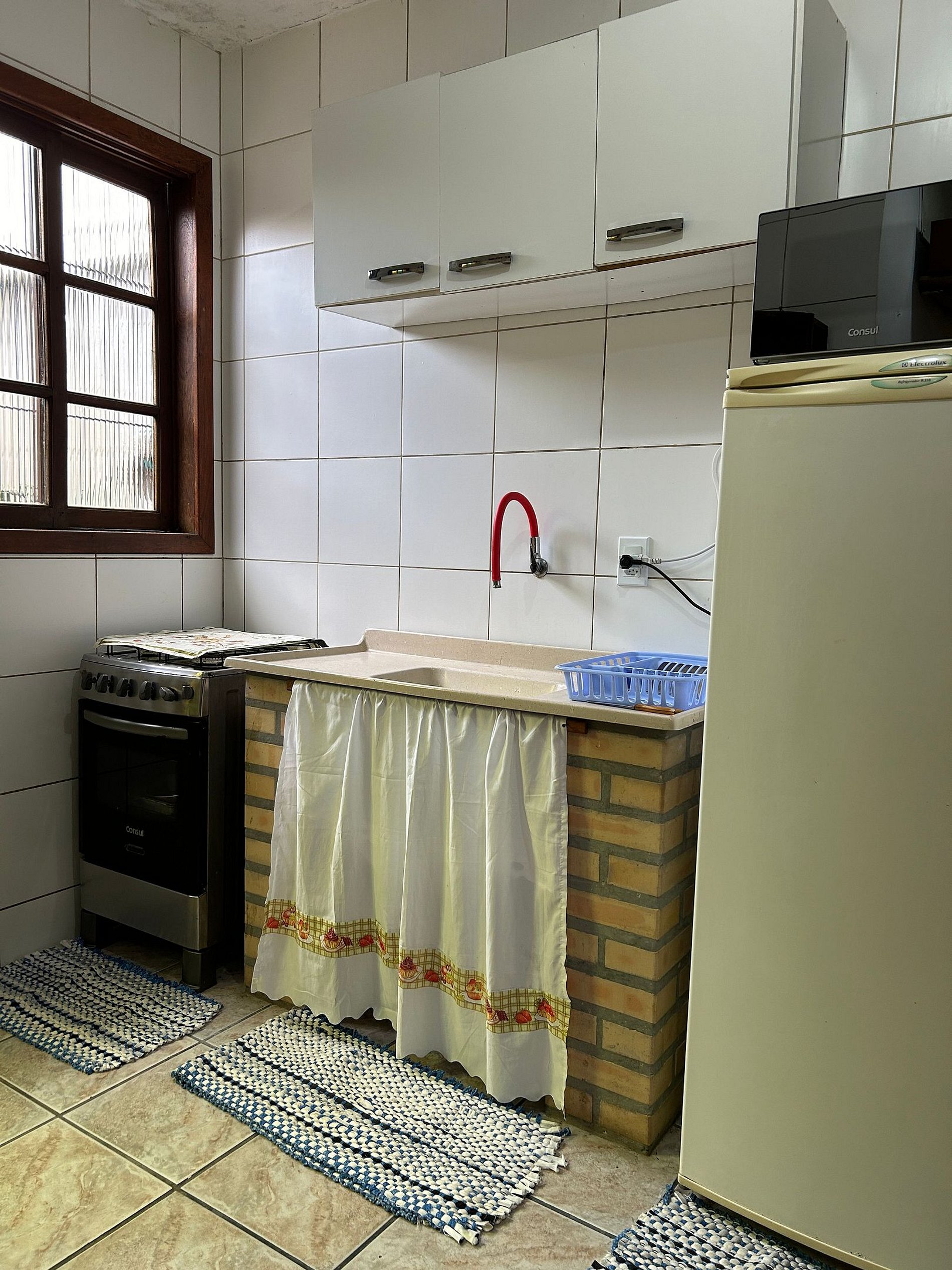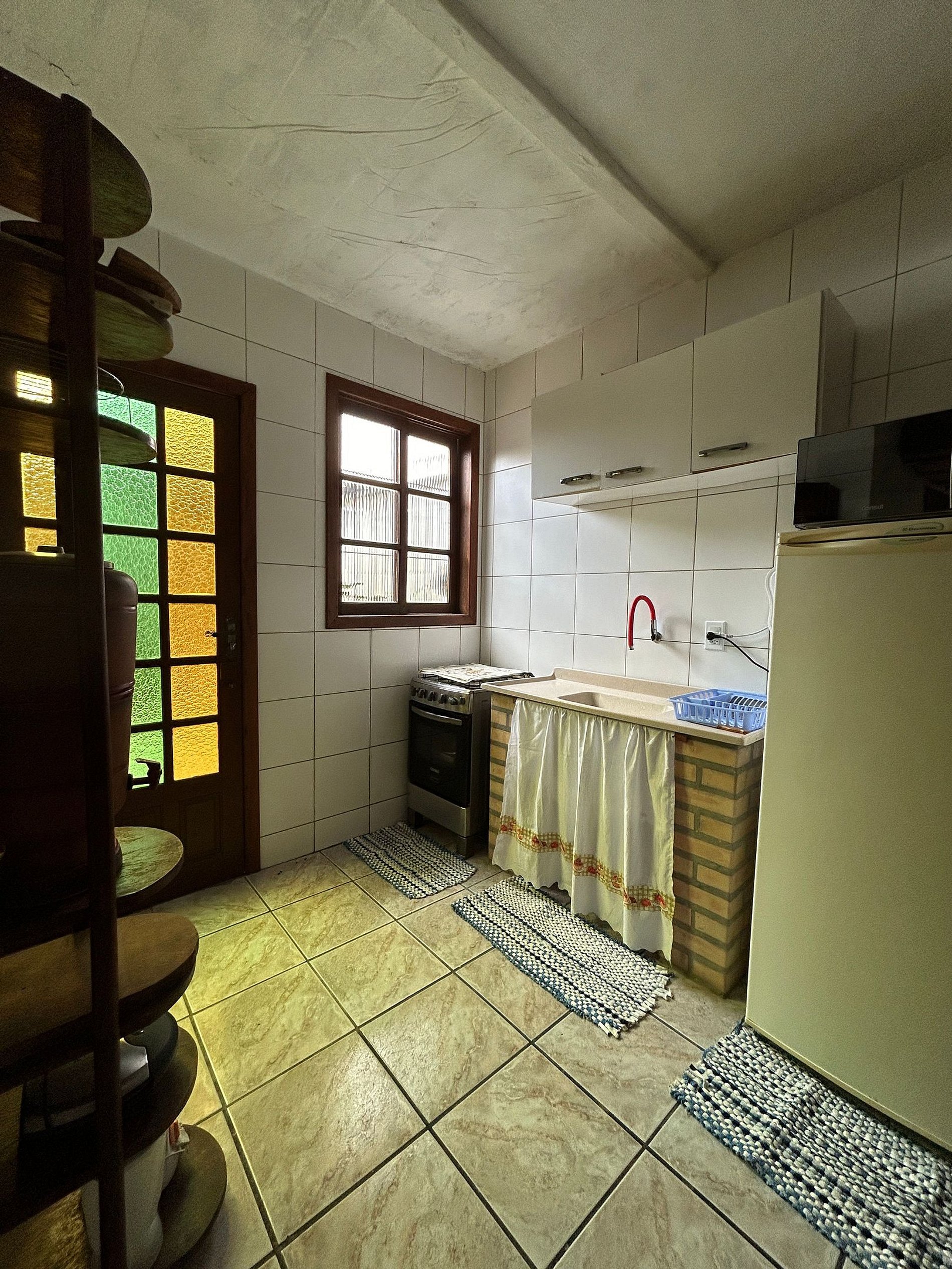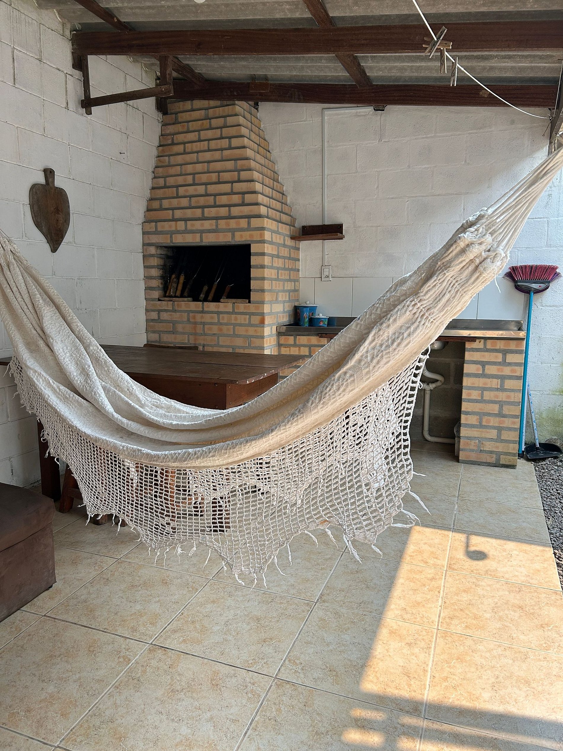 Com 2 quartos, do um com cama de casal e ar condicionado e outro com cama de casal e ventilador, esse não tem janela externa, e sim passagem de ar sobre a porta, um banheiro, uma sala com sofá que serve também de cama de solteiro com cozinha compacta,fogão com forno, geladeira, micro-ondas, armário com louças.espaço externo com churrasqueira, mesa, rede de descanso,e pia para preparo das carnes.